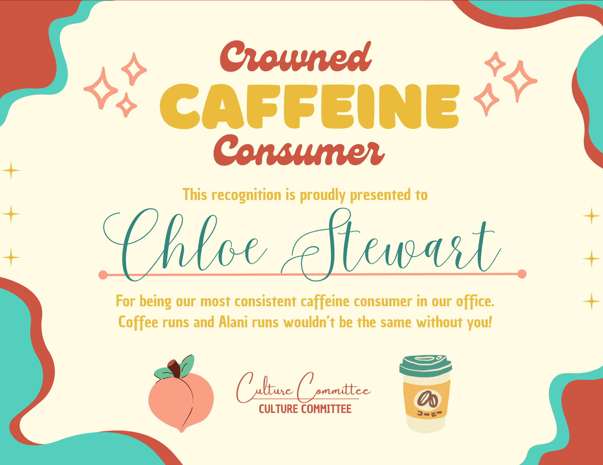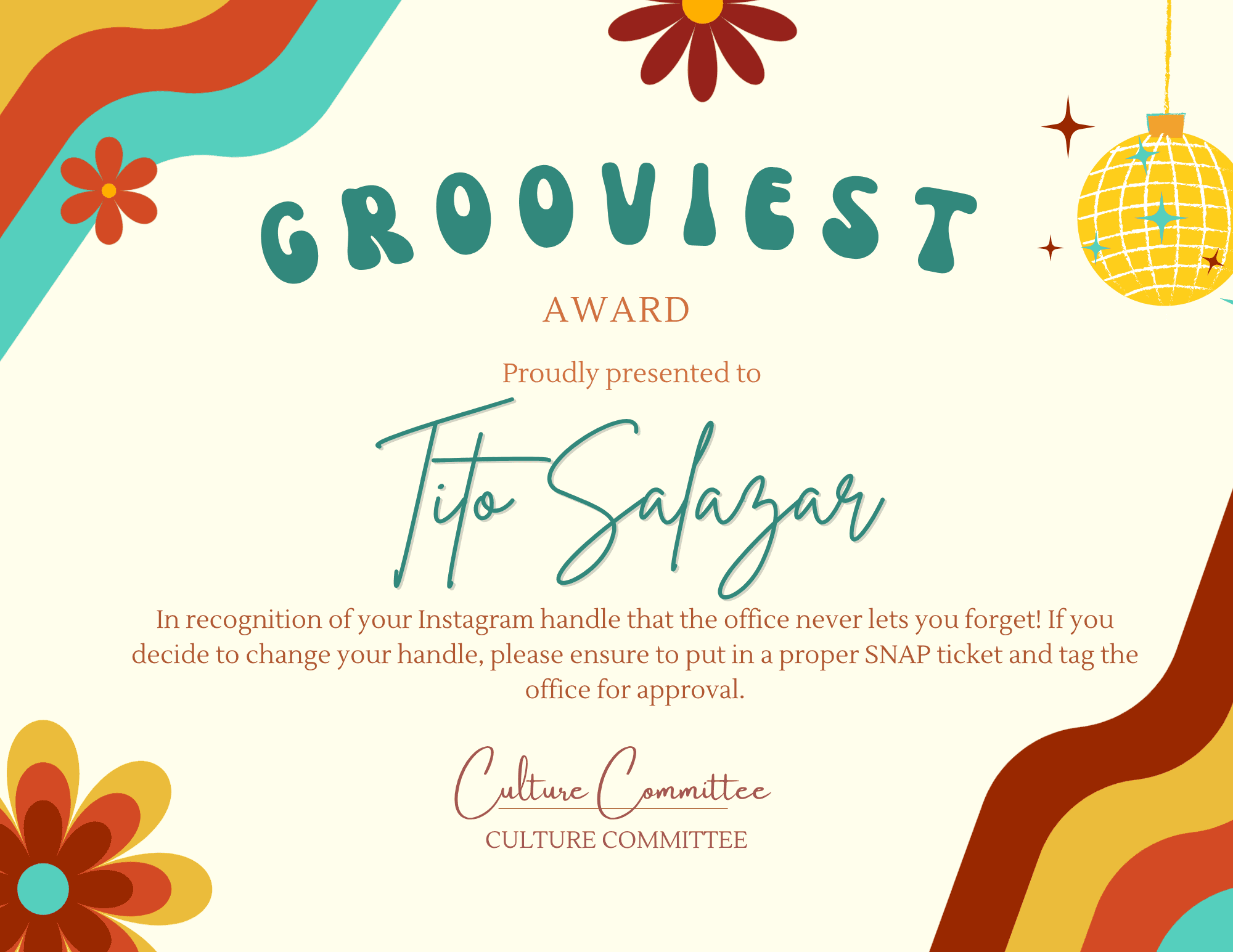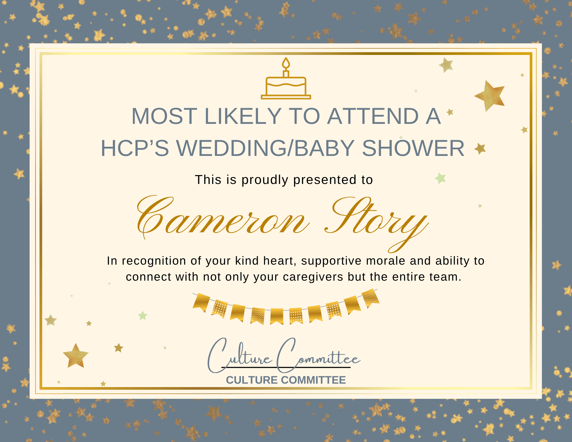 As the leader of the Culture Committee, I brought some lighthearted fun to our end-of-year holiday party by designing a custom collection of office superlatives for the team.