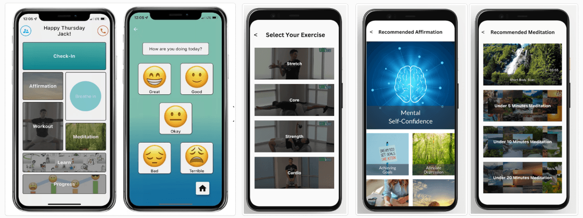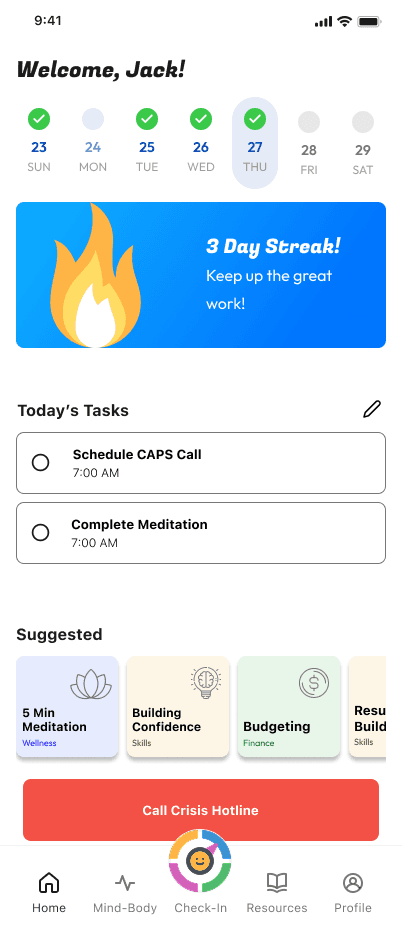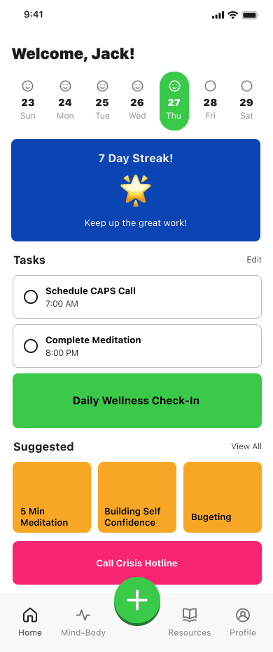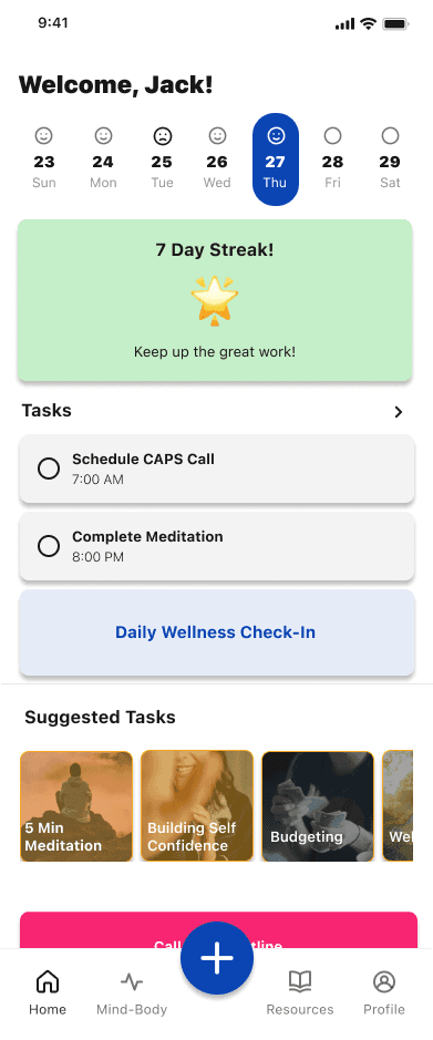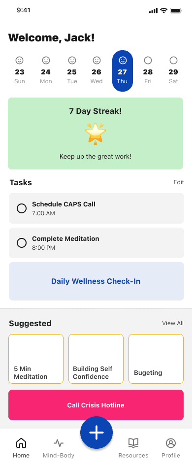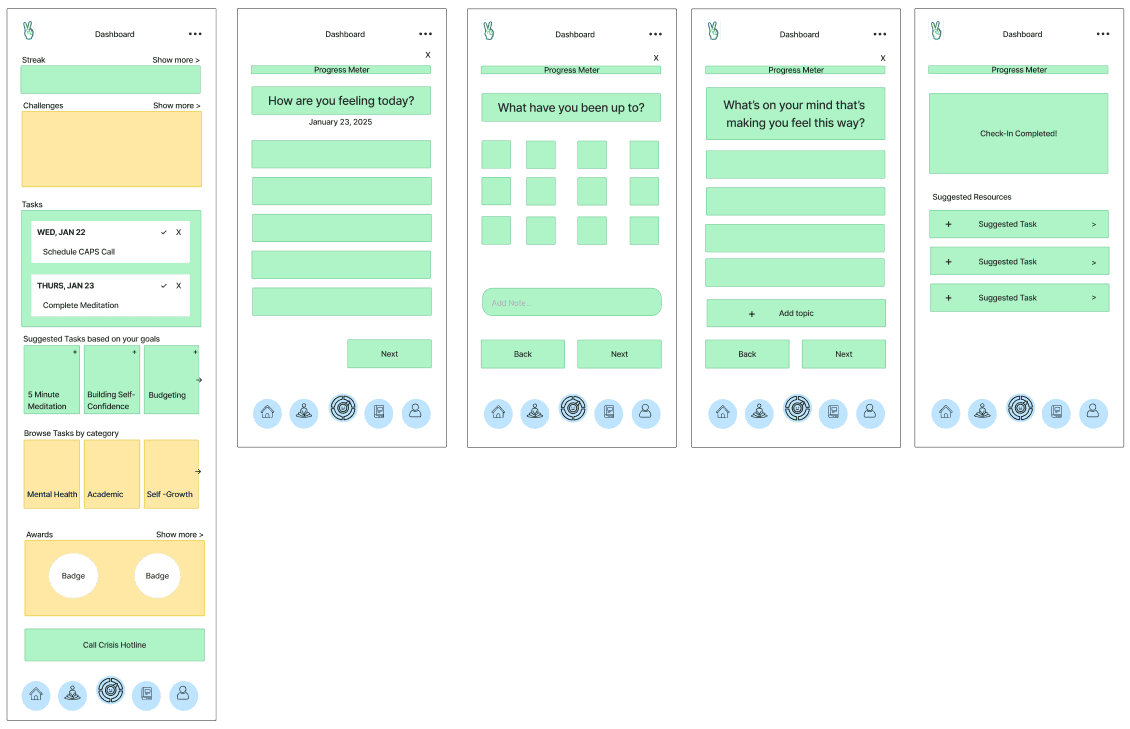 Next, a mid-fi prototype for UBYou was created, designed for the next set of interns to test key features and refine the app based on user feedback. This prototype focuses on the core user flow of the mental wellness check in and navigating through the campus resources.