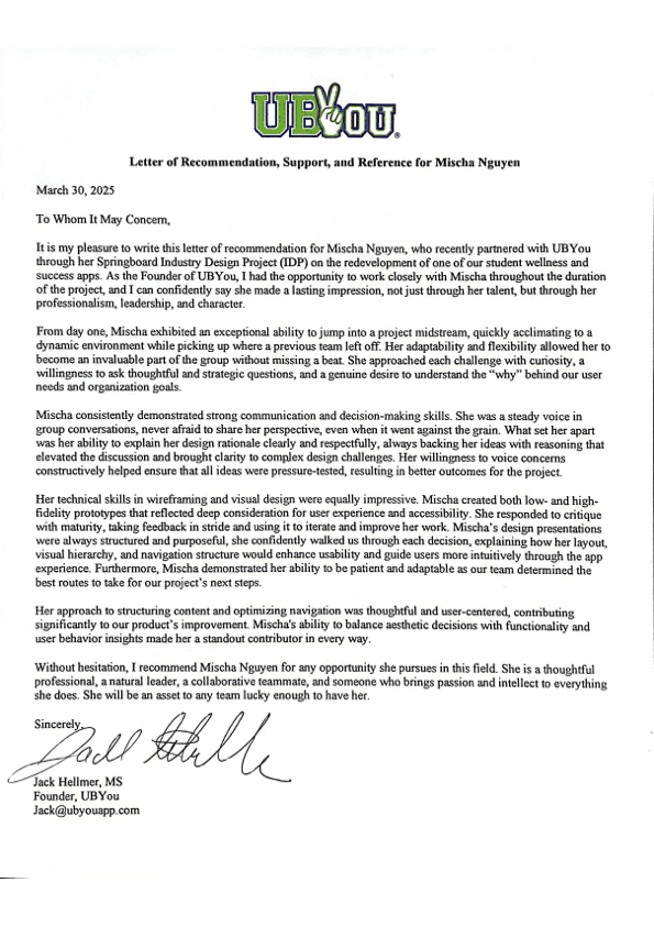 One of the key learning experiences of this internship was navigating team disagreements. The design lead at UBYou faced a lack of trust from the intern team. While I attempted to mediate, the team collectively requested new assignments, a request that was ultimately denied.