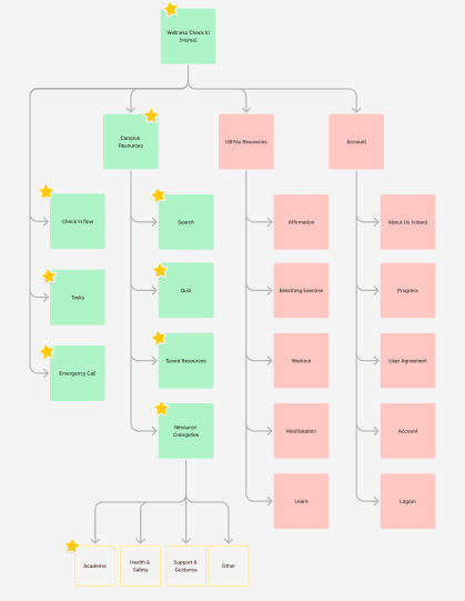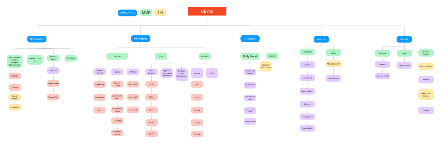 We prioritized features that would provide immediate value while allowing room for future expansion. Alongside this, we restructured the app’s information architecture to improve navigation and clarity. By organizing content into a clear and intuitive site map, we streamlined the user experience, ensuring students could easily access the resources they needed without feeling overwhelmed. This process laid the foundation for a more cohesive and user-friendly app.